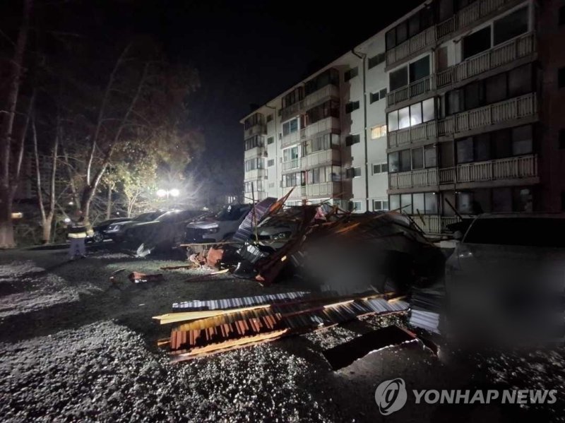 (속초=연합뉴스) 박영서 기자 = 1일 오전 2시 53분께 강원 속초시 교동 한 아파트 주차장에 지붕 구조물이 날아들어 차량 6대가 부서졌다.