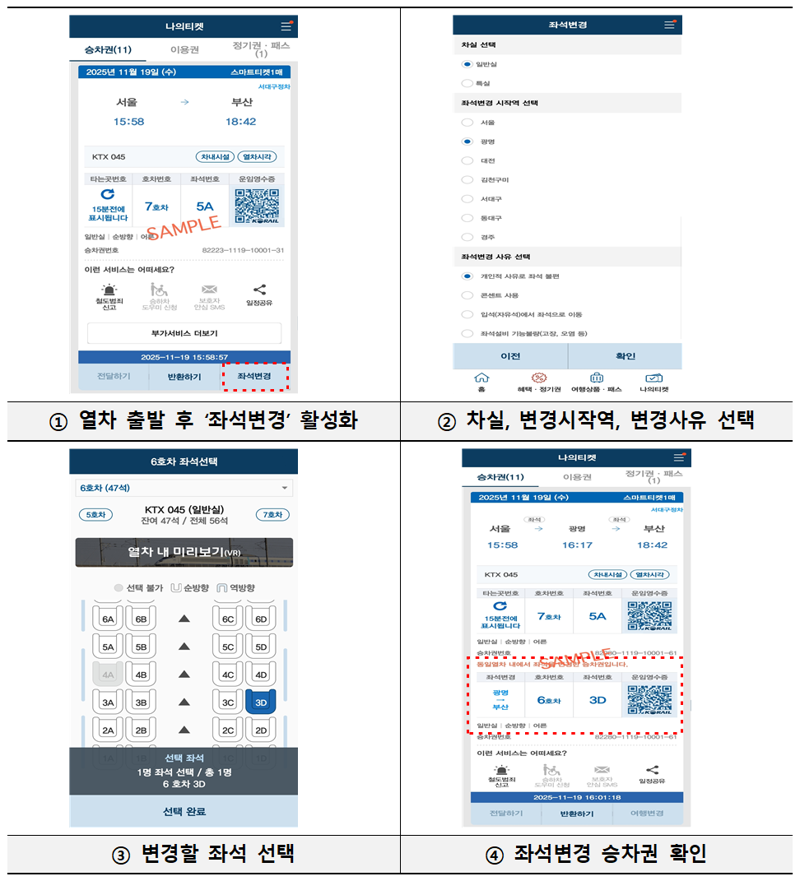 그동안 좌석을 바꾸려면 승무원 호출 서비스 이용 또는 순회 중인 승무원을 직접 찾아 요청해야 했다. 이번 서비스로 열차 출발 후에도 코레일톡 '나의 티켓' 승차권 화면에서 '좌석변경'을 선택해 차실, 변경 시작역, 변경 사유 입력 후 시트맵에서 원하는 좌석을 골라 변경할 수 있다.