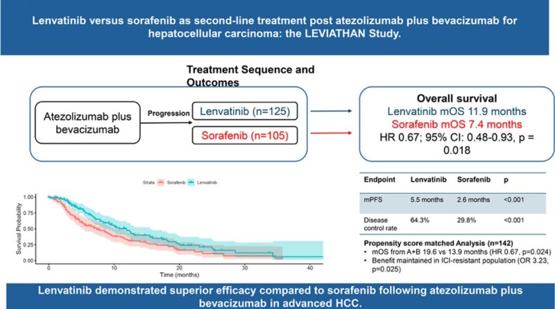 대규모 임상 연구 결과, 아테졸리주맙 베바시주맙 병용 치료 후 진행된 간세포암 환자에서 2차 치료로 렌바티닙을 투여한 환자는 무진행 생존기간(PFS) 5.5개월, 전체 생존기간(OS) 11.9개월을 기록해 소라페닙 투여군(PFS 2.6개월, OS 7.4개월)보다 모두 유의하게 연장됐다.