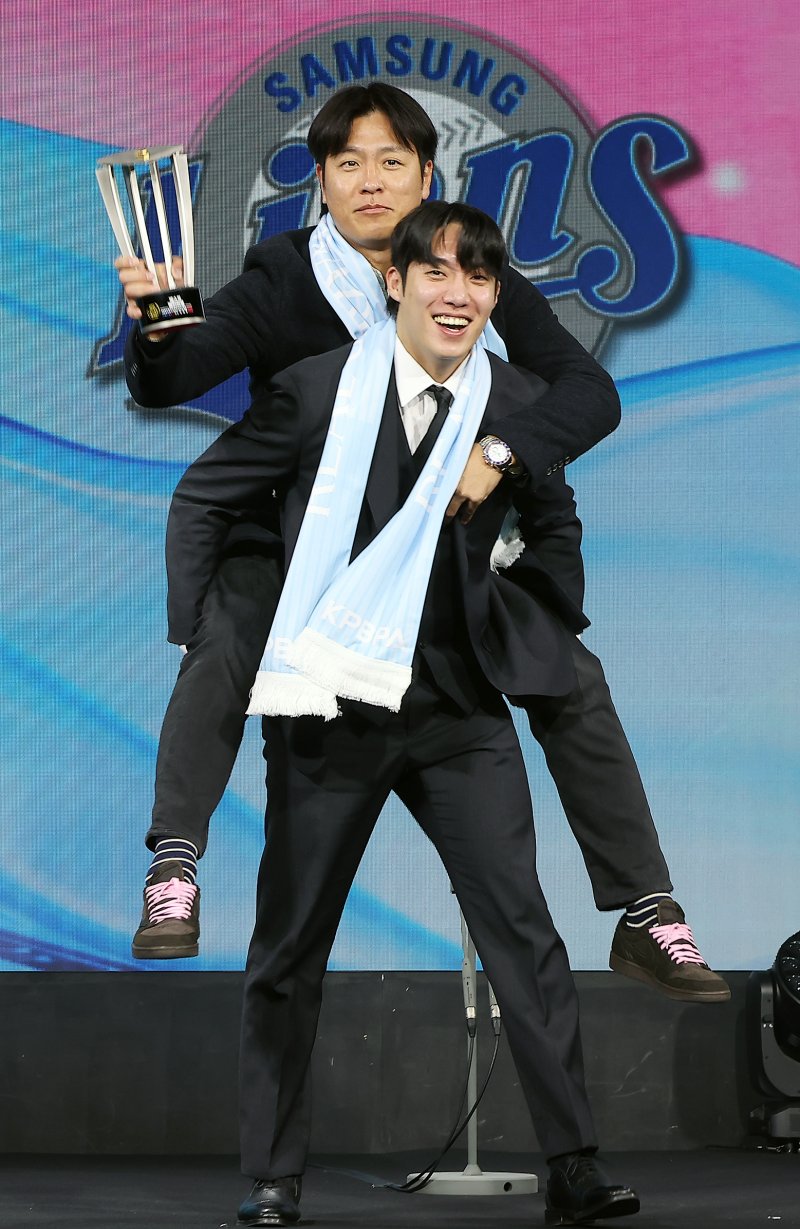 수상 발표 후 시상대에 오른 두 선수는 원태인이 강민호를 등에 업는 세리머니를 보여 시상식장을 웃음바다로 만들었다.