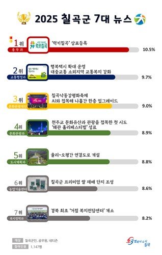 (칠곡=연합뉴스) 김현태 기자 = 경북 칠곡군은 화제가 됐던 17개 지역뉴스 중 군민 1천147여명의 투표로 뽑은 '2025년 칠곡군 7대 뉴스'를 1일 발표했다.