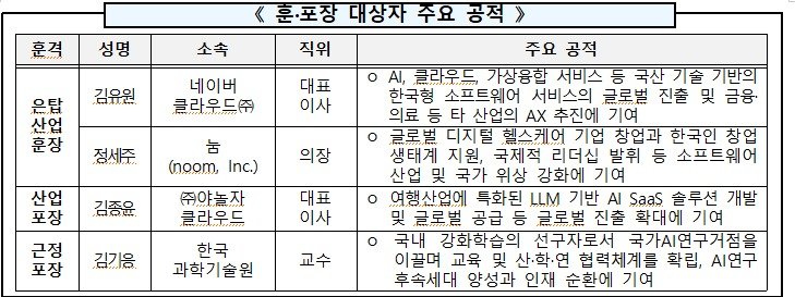 은탑산업훈장은 김유원 네이버클라우드 대표와 정세주 눔(Noom) 의장이 받았다. 김 대표는 국산 AI·클라우드 기반 서비스의 해외 진출과 산업별 AX(디지털 전환) 확산 공로를, 정 의장은 글로벌 디지털 헬스케어 기업 창업과 혁신 생태계 기여가 인정됐다.