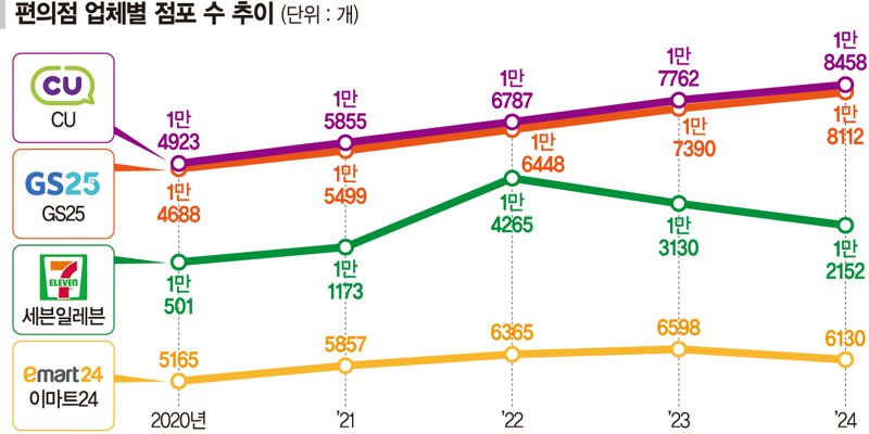 지난해부터는 업계 1, 2위인 BGF리테일의 CU와 GS리테일의 GS25 역시 점포 수 확대를 자제하고 있다. 지난해 가맹점 913개를 닫은 CU는 2023년(754개) 대비 폐점이 20% 이상 늘었다. GS25는 CU보다 많은 1068개를 닫았다. 작년(725개)과 비교하면 50% 가까이 늘어난 규모다. 다만 CU, GS25는 신규 가맹점을 동시에 늘리면서 전체 편의점 수는 전년 대비 각각 696개, 772개 늘었다. 매년 1000개 가까이 매장을 늘리던 CU는 올해 200~300개 수준으로 매장 확대를 자제한다는 방침이다.