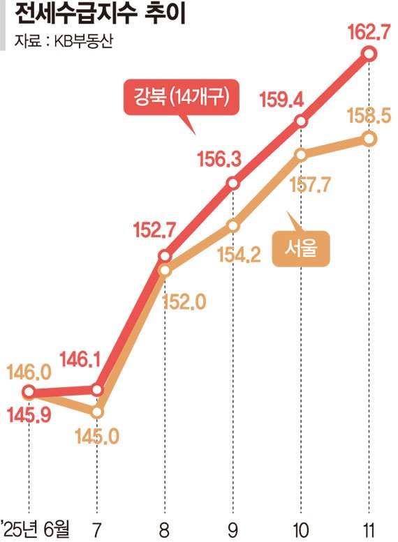 수도권에서 수급지수가 160을 돌파한 곳은 강북만이 아니다. 인천은 10월 159.3, 11월에는 163.7을 기록했다. 지난 2021년 하반기 이후 첫 160 돌파다. 경기 역시 이 기간 154.6에서 157.9로 껑충 뛰었다. 전국 전세수급지수도 11월 159.6을 기록하며 조만간 160 돌파가 확실시된다. 고준석 연세대 상남경영원 교수는 "전국 전세수급지수가 전세대란이 벌어졌던 지난 2021년 하반기 이후 최고치를 기록하고 있다"고 전했다.