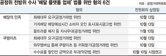 1일 배달업계와 공정위에 따르면 배달의민족과 쿠팡이츠는 각각 3건씩 공정거래법·표시광고법·약관법 위반 혐의를 받고 있다. 공정위는 이 가운데 5건에 대해 심사보고서를 발송하고 전원회의에 상정했다. 쿠팡이츠의 약관법 위반 혐의는 현재 시정권고 단계로, 권고를 받아들이지 않을 경우 심사보고서가 추가 송부돼 소회의에서 심의가 진행될 예정이다.