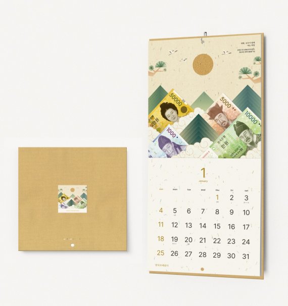 프리미엄 돈달력은 화폐 속 인물과 유적을 통해 한국 문화와 역사를 재해석한 스토리텔링 콘셉트로, 내지에는 화폐 부산물로 만든 친환경 용지를 사용해 ‘돈가루’를 육안으로 확인할 수 있다.