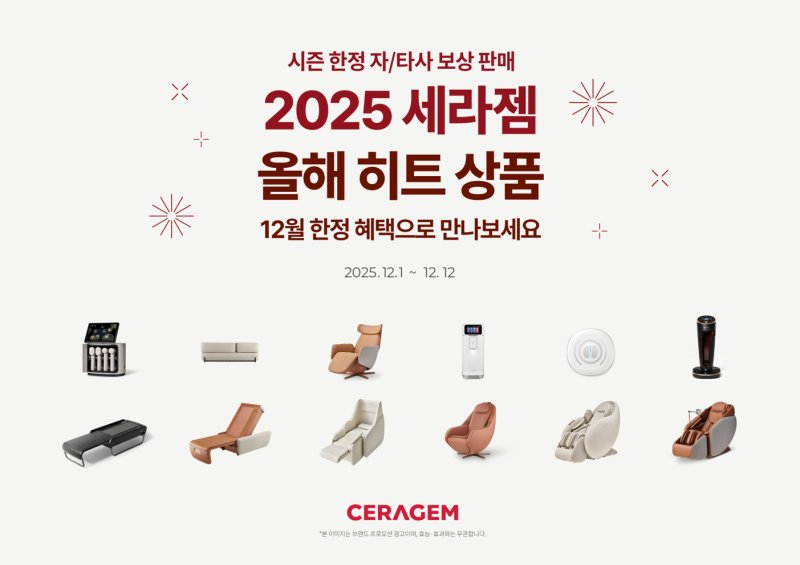 세라젬 관계자는 "연말 연시에 건강 관리에 대한 관심이 커지고, 특히 겨울철에는 온열 기능을 갖춘 세라젬의 대표 인기 제품들을 찾는 소비자들이 늘어난다"며 "더 많은 고객이 세라젬의 다양한 제품을 합리적인 비용으로 경험할 수 있도록 올해 많은 관심을 받은 제품들을 중심으로 혜택을 강화해 프로모션을 진행하게 됐다"고 말했다.