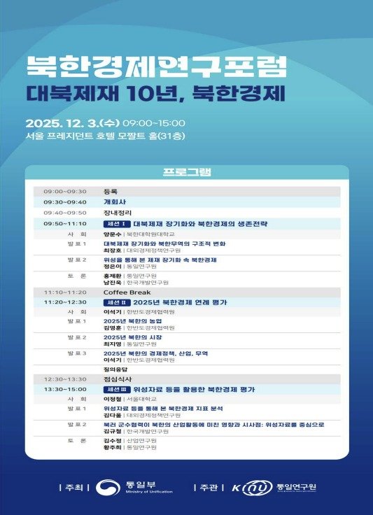 포럼은 3개의 세션으로 구성되며 △대북제재 장기화와 북한 경제의 생존 전략 △경제정책·산업·농업·시장 등 분야별 2025년 북한 경제 연례 평가 △위성 자료 등을 바탕으로 분석한 북한 경제 상황 등이 논의된다.