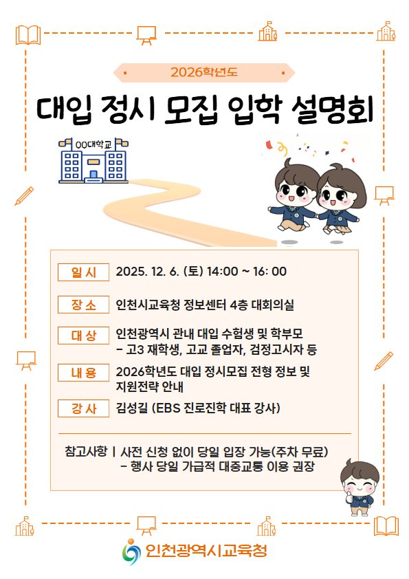 참석자들에게는 인천진로진학지원단에서 제작한 '2026학년도 정시모집파노라마'도 배포한다.