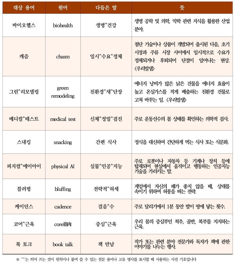 신기술·게임 분야에서는 '피지컬 AI'를 '실물 인공 지능', '블러핑'을 '전략적 허세'로 다듬었다. '바이오헬스'는 '생명 건강'으로 제시했다. 붙임(목록)에는 뜻풀이와 함께 10개 항목이 표로 정리됐다.