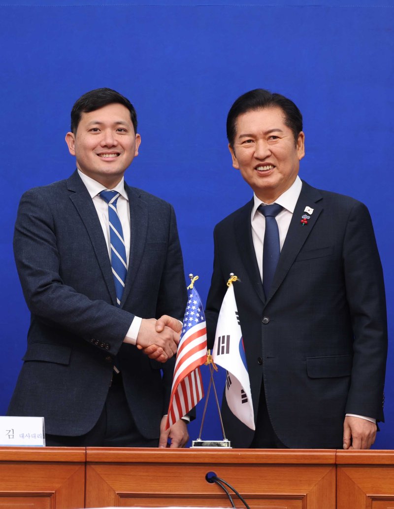 또 "이재명 정부와 민주당은 양국이 모든 방면에서 최상의 동맹을 이어나갈 수 있도록 지속적으로 노력하겠다"며 "김 대사대리께서 스몰 피스 메이커, 저는 스몰 페이스 메이커 역할을 각자 위치에서 한다면 트럼프 대통령에게도 이재명 대통령에게도 도움이 되리라고 생각한다"고 덧붙였다.