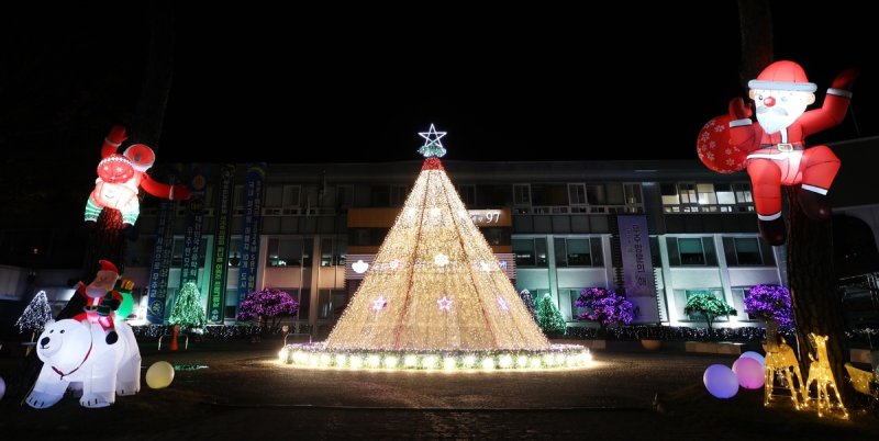 (무주=연합뉴스) 전북 무주군은 2일 군청 앞 분수대 광장에 성탄 트리 조형물을 점등했다고 밝혔다.