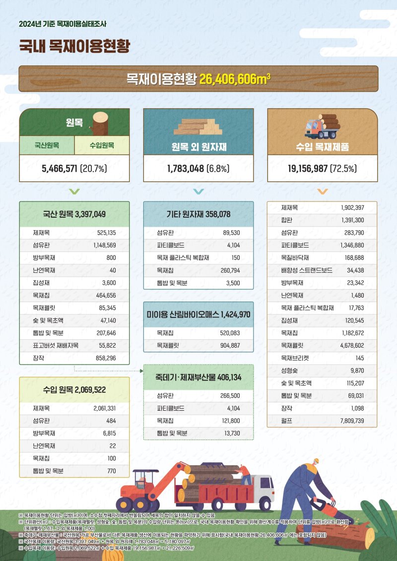 2일 산림청에 따르면 우리나라의 2024년 전체 목재이용량은 2641만㎥이며, 국산 원목과 원목외 원자재를 포함한 국산 목재 이용량은 518만㎥, 수입 원목과 수입 목재제품을 포함한 수입 목재 이용량은 2123만㎥이다.