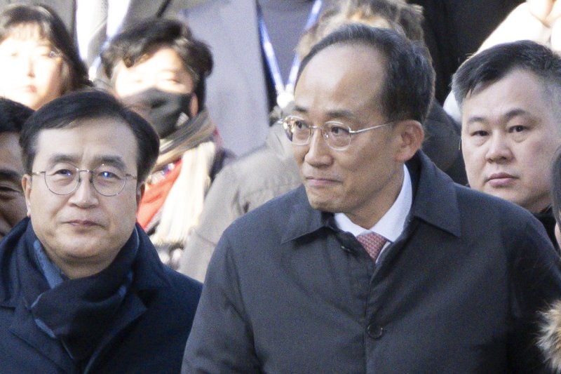 계엄 해제 표결 방해 혐의를 받는 추경호 국민의힘 전 원내대표가 2일 서울 서초구 서울중앙지방법원에서 열린 구속 전 피의자심문(영장실질심사)에 국민의힘 의원들의 응원을 받으며 출석하고 있다. 사진=뉴스1