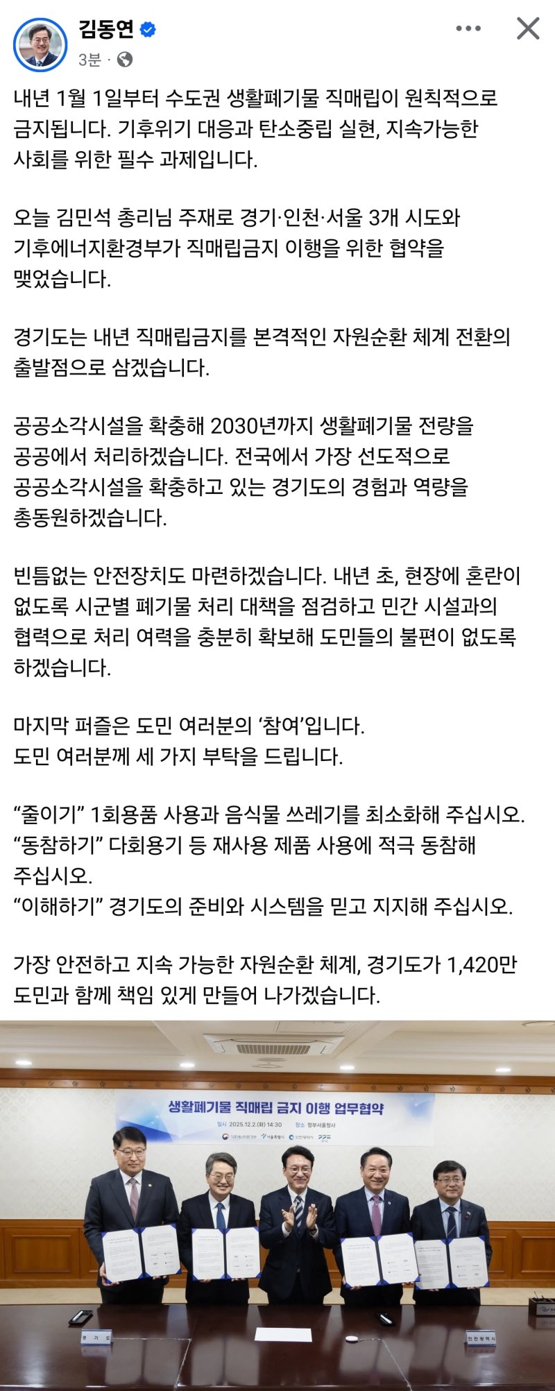 김 지사는 정책 성공을 위한 도민의 참여도 요청했다. 그는 △1회용품 및 음식물 쓰레기 줄이기 △다회용기 등 재사용 제품 사용 △경기도 시스템에 대한 신뢰와 지지를 당부하며 “1420만 도민과 함께 안전하고 지속 가능한 자원순환 체계를 완성하겠다”고 약속했다.