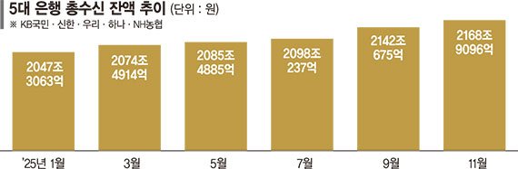 2일 금융권에 따르면 KB국민·신한·우리·하나·NH농협 등 5대 시중은행의 총수신 잔액은 지난달 말 기준 2168조9096억원으로 집계됐다. 10월 말(2151조1806억원)과 비교해 17조7290억원 증가한 규모다.
