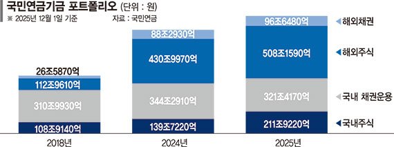 국민연금의 해외 주식 운용 규모는 지난해 430조9970억원에서 2025년 508조1590억원으로 1년 새 77조원 이상 늘었다. 지난 2018년 말 112조9610억원과 비교하면 7년 사이 5배 가까이 급증한 규모다. 같은 기간 국내 주식 운용 규모는 108조9140억원에서 211조9220억원(2025년 12월 1일기준)으로 늘어났다. 시장에서는 최근 원·달러 환율 상승의 배경으로 개인 투자자의 해외주식 투자뿐 아니라 기관투자자의 해외 자산 비중 확대도 영향을 끼쳤다는 분석을 내놓고 있다.