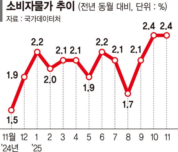 이날 구윤철 경제부총리 겸 기재부 장관은 물가상승 원인으로 "지난해 11월 낮았던 물가(1.5%)에 따른 기저효과와 올 상반기 가공식품 가격이 집중 인상돼 높은 수준을 유지하고 있다"며 "잦은 강우 등 기상악화와 환율 상승 등 영향으로 농축수산물과 석유류 가격 상승 폭이 확대된 데 기인하고 있다"고 했다.