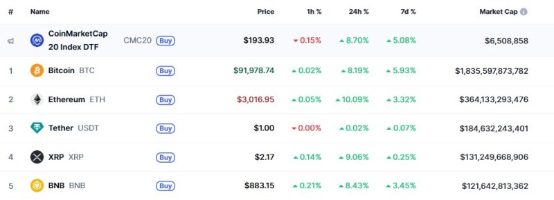 3일 오전 5시 현재 글로벌 코인 시황 중계사이트 코인마켓캡에서 비트코인은 24시간 전보다 8.19% 급등한 9만1978달러를 기록하고 있다.