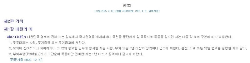 3. 법제처 국가법령정보센터 형법 제87조(내란) - https://www.law.go.kr/lsSc.do?query=형법#undefined