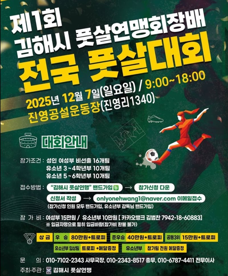 김해시풋살연맹이 주최·주관하며 김해시와 시의회, 체육회 등이 후원한다. 유소년·여성 대상 전국대회가 김해에서 처음 개최되는 만큼 지역 풋살 저변 확대에 기여할 것으로 기대된다.