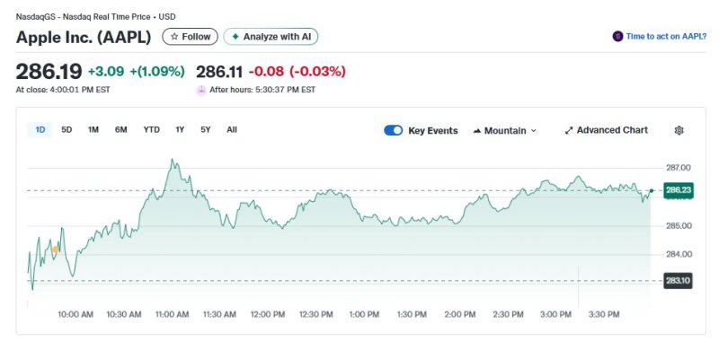 2일(현지 시각) 뉴욕증시에서 애플은 1.09% 상승한 286.19달러를 기록했다. 이는 사상 최고치다. 이로써 시총도 4조2470억달러로 늘었다.