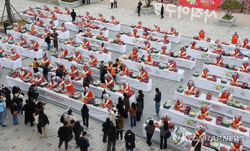 (부산=연합뉴스) 김선호 기자 = 부산지역 롯데 21개 계열사 임직원 100여명이 3일 오전 사직야구장 정문 광장에서 '2025 롯데 사랑 나눔 프로젝트, 1만 포기 김치 담그기' 행사를 한다.