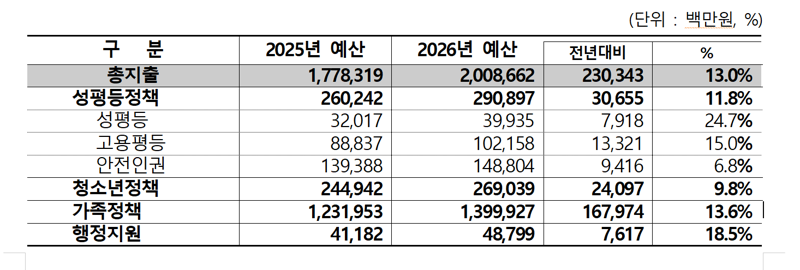 성평등가족부는 내년도 성평등가족부 예산이 총 2조 87억원으로 확정됐다고 3일 밝혔다. 올해(1조 7783억 원) 대비 2303억원(13%) 증가된 규모다. 국회 예산 심의 과정에서 정부안 대비 총 91억원이 증액됐다.