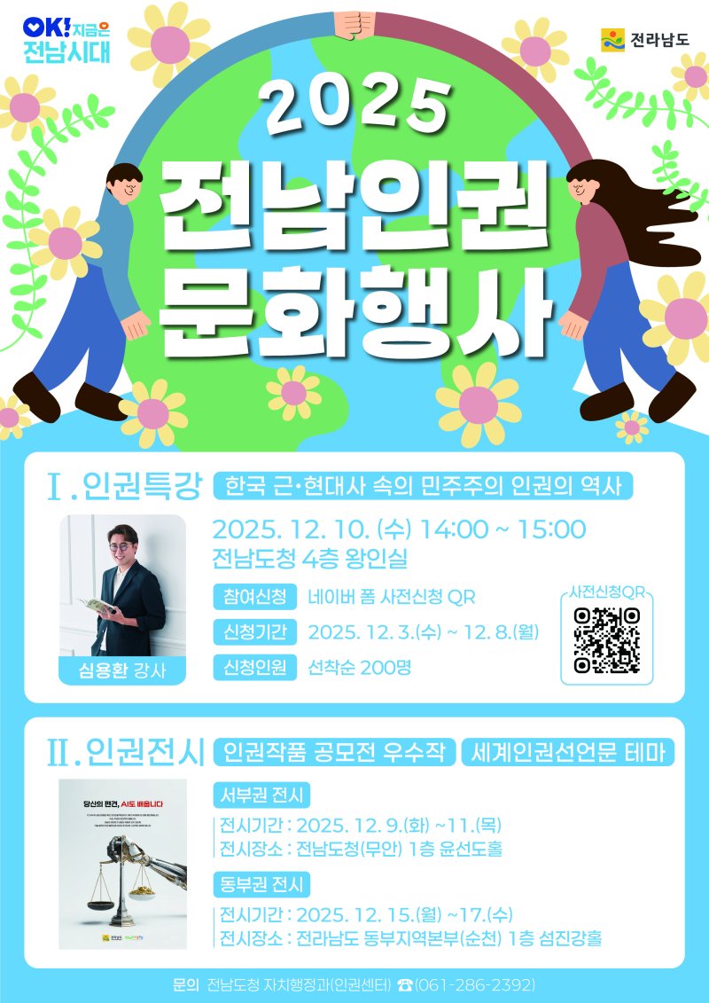 [무안=뉴시스] 구용희 기자 = 전남도는 세계인권선언 77주년을 맞아 9일부터 17일까지 인권 특강·인권공모전 우수작 전시회 등 올해 도민인권증진 문화행사를 연다고 3일 밝혔다.
