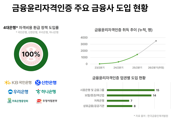 금융상품을 다루는 전문인력과 임직원의 금융윤리역량 강화를 목적으로 설계된 '금융윤리자격인증'도 적극적으로 취득하고 있다. 주요 4대 은행(KB국민·신한·하나·우리) 뿐만 아니라 증권사(하나증권, KB증권), 저축은행(OK금융그룹, 웰컴저축은행, 저축은행중앙회 회원사), 신용보증재단(충북·전북·대전) 등 금융권 전반적으로 확산되고 있다.