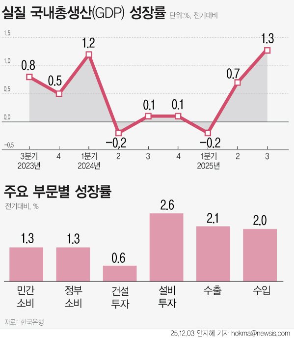 [서울=뉴시스]남주현 기자 = 우리나라의 3분기(7~9월) 국내총생산(GDP) 성장률이 1.3%를 기록해 3년9개월 만에 최대 성장을 기록했다. 정부의 소비쿠폰 정책 효과 등에 따른 내수 회복세가 컸고 예상 밖의 건설투자·설비투자 개선세도 더해졌다. 수출도 미국 관세 여파에도 반도체를 중심으로 호조세를 지속했다.