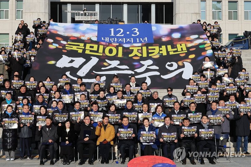 '계엄 1년' 국회 본청 앞에 모인 與…"尹내란 아직도 진행형"12·3 기념법도 발의…"비범한 이웃 '빛의 혁명' 지키자"