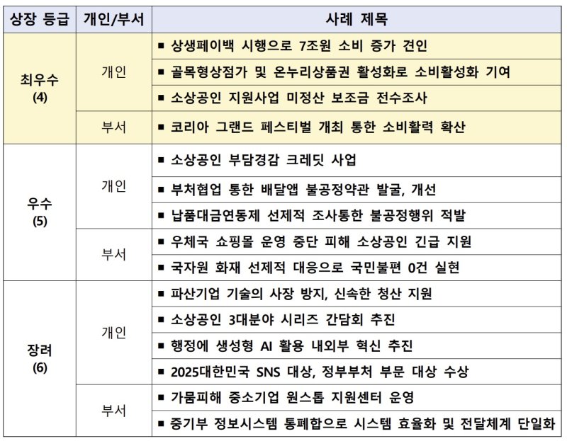 최우수 사례는 △폐업 소상공인 지원수당 비과세 △대국민 소비활성화 프로젝트인 상생페이백 △골목형 상점가 및 온누리 상품권 활성화 △코리아 그랜드 페스티벌(코그페) 개최 △소상공인 지원사업 미정산 보조금 전수조사 △신용보증재단중앙회의 문자메시지 서류 수신 시스템 구축이다.