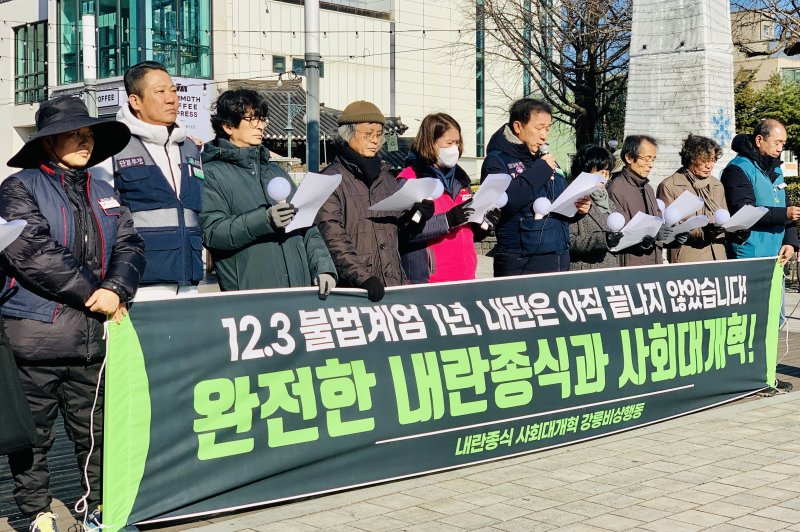 강릉지역 시민단체인 '강릉비상행동'은 3일 오전 강릉 월화거리에서 계엄 사태 1년 관련 기자회견을 열고 윤석열 전 대통령과 관련 세력의 청산을 촉구했다.