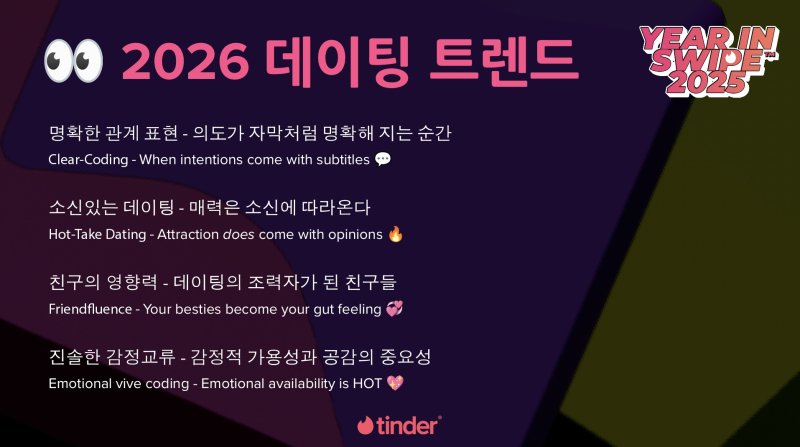 한편 틴더는 한국 이용자 트렌드도 분석했다. 인기 셀럽으로 ▲수지 ▲마크 ▲아이유 ▲로제 ▲박보검 ▲손흥민 ▲에스파 ▲블랙핑크 ▲지드래곤 ▲추영우 등을 꼽았다.