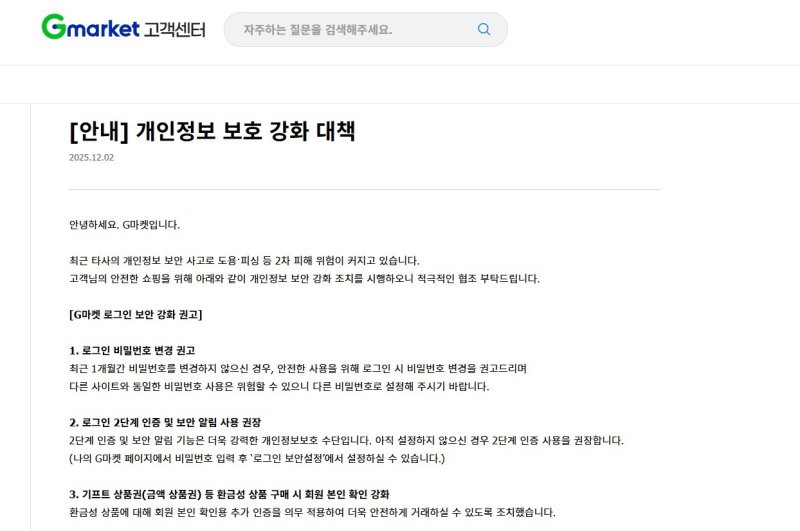 G마켓은 공지사항을 통해 "최근 타사의 개인정보 보안 사고로 도용·피싱 등 2차 피해 위험이 커지고 있다"면서 로그인 비밀번호 변경 권고, 로그인 2단계 인증 및 보안 알림 사용 권장 등을 안내했다.