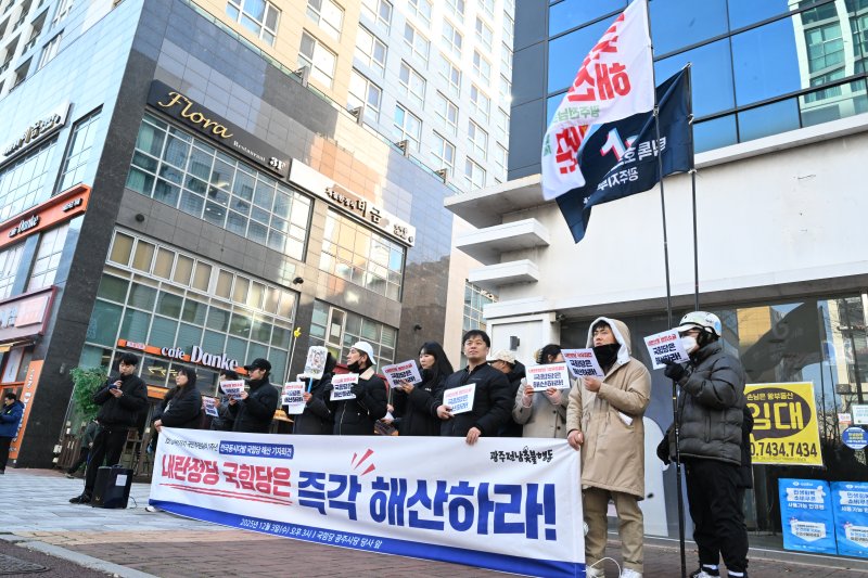 광주·전남 시민사회 단체로 구성된 광주전남촛불행동은 이날 오후 광주 서구 국민의힘 광주시당 앞에서 기자회견을 열어 "12·3 불법 계엄이 발생한 지 1년이 됐지만 국힘이 아직도 국회 다수당을 차지하는 것 자체가 내란의 연장이며 빛의 혁명에 대한 모욕"이라며 이같이 밝혔다.