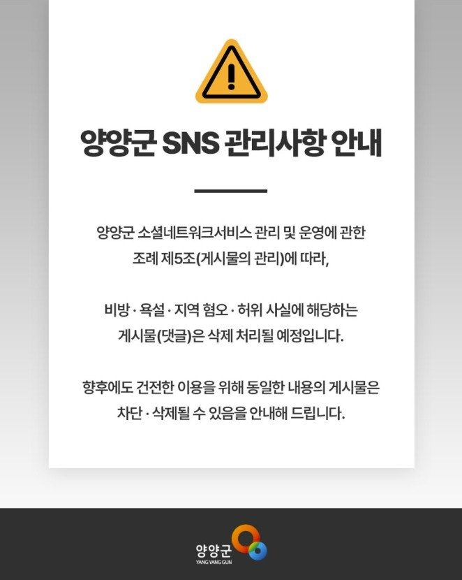 양양군, 성토장된 SNS 댓글 관리 강화…표현의 자유 침해 우려도갑질 공무원 논란 등 비판 댓글 잇따라…지역 혐오 등 포함 시 삭제