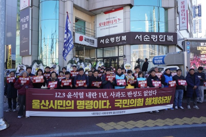 (울산=뉴스1) 박정현 기자 = 울산 지역 시민사회단체들이 12·3 비상계엄 1년을 맞아 국민의힘을 '내란 정당'으로 규정하고 즉각적인 해산을 촉구했다.