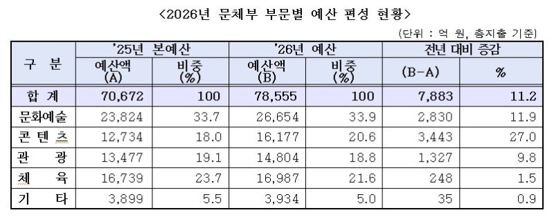 문체부는 이재명 대통령 공약인 'K-컬처 300조원 시대' 달성을 위해 콘텐츠산업의 국가전략산업화와 국민이 함께 누리는 관광 등에 주력해 예산을 편성했다고 설명했다.