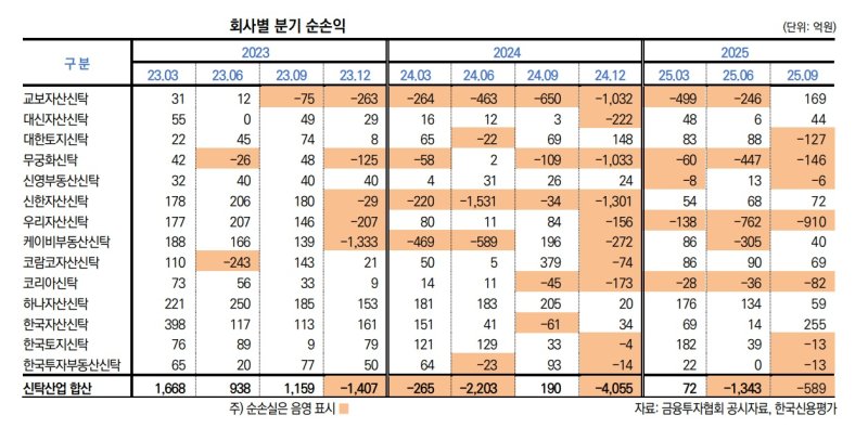 3분기 순손실을 기록한 업체는 대한토지신탁, 무궁화신탁, 신영부동산신탁, 우리자산신탁, 코리아신탁, 한국토지신탁, 한국투자부동산신탁 등 7개사였다.