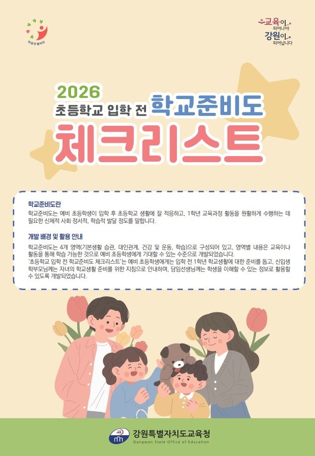 (강원=뉴스1) 한귀섭 기자 = 강원특별자치도교육청이 3일부터 도내 초등학교에 초등학교 1학년 예비 학부모를 대상으로 ‘2026 초등학교 입학 안내서 및 입학 전 학교준비도 체크리스트(진단도구), 입학준비 도움자료’를 보급한다.