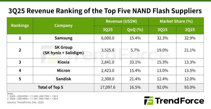 시장조사업체 트렌드포스는 올해 3분기 삼성전자·SK하이닉스(솔리다임 포함)·키옥시아·마이크론·샌디스크 등 5개 기업의 낸드플래시 메모리 매출이 170억9800만달러를 기록했다고 3일 밝혔다. 전 분기 대비 16.5% 증가했다.