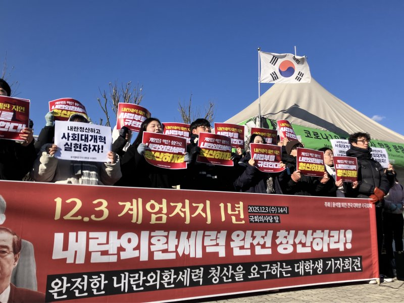 이날 오후 2시 국회 앞에서 기자회견을 연 윤석열 퇴진 전국 대학생 시국회의는 윤석열 전 대통령 구속 만료를 앞두고 사법부와 국민의힘을 규탄했다. 참가 대학생들은 '계엄을 막은 힘으로 내란외환세력 청산하자!' 등의 손팻말을 들고 "내란세력 재판 지연 사법부를 규탄한다", "헌법질서 파괴하는 내란 외환세력 완전히 청산하자" 등의 구호를 외쳤다.