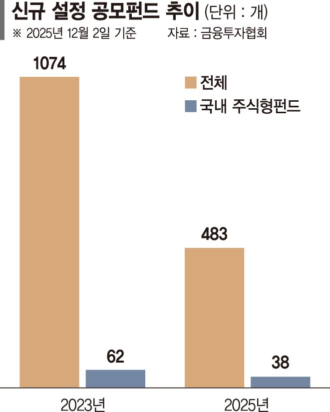 특히 코스피 지수가 올해 사상 첫 4000선을 돌파하면서 역대급 호황을 누렸음에도 국내 주식형 공모펀드 출시는 부진했던 것으로 나타났다. 2023년 62개에서 지난해 56개로 쪼그라들었고, 올해는 38개 출시에 그쳤다.