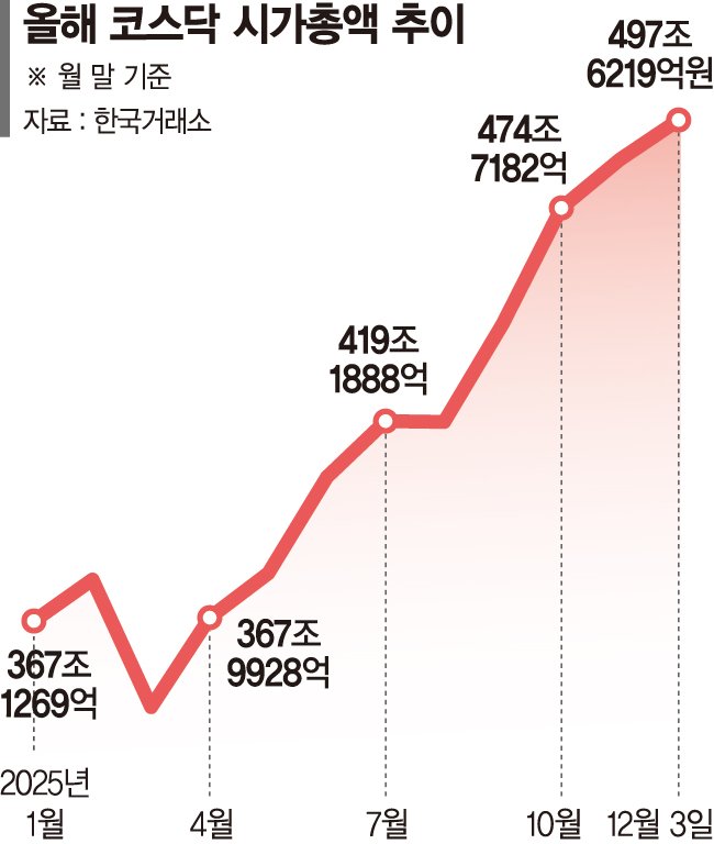 코스닥 시총은 지난 2021년 1월 25일(400조4966억원) 400조원을 넘어선 이후 5년 가까이 300조~400조원대에 갇혀 있다.