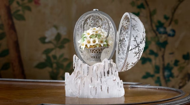 이번에 경매에 나온 달걀은 높이 약 10cm로 세공된 크리스털로 제작됐으며, 백금과 약 4500개의 다이아몬드로 장식된 눈송이 무늬가 특징이다.