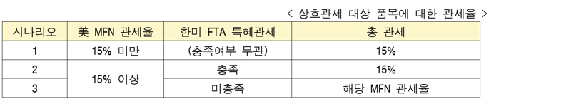 상호관세, 목재 제품에 대한 232조 관세 및 항공기·부품에 대한 관세 인하는 한미 전략적 투자 양해각서(MOU) 서명일인 11월 14일자로 소급해 적용된다. 상호관세 대상 품목의 경우, 8월 7일부터 미국의 MFN 관세 또는 한미 FTA 특혜세율에 더하여 15%가 추가돼 부과되고 있었으나, 11월 14일자로 MFN 관세가 15% 미만이면 총 15%의 관세만 소급돼 적용된다. 미국 MFN 관세율이 15% 이상인 품목도 한미 FTA를 충족하는 경우 총 15% 관세만 부과된다.