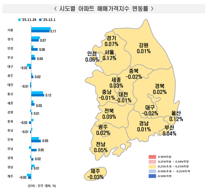 4일 한국부동산원이 발표한 '12월 1주(1일 기준) 주간 아파트가격 동향'에 따르면 서울 아파트 매매가격은 전주 대비 0.01%p 내린 0.17%를 기록했다. 서울 아파트 매매가 상승은 지난 2월부터 43주째 이어지고 있다.