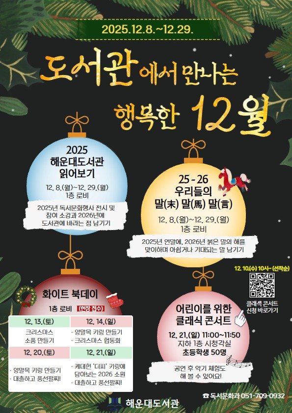 해운대도서관은 오는 8~29일 1층 로비와 시청각실에서 주민을 대상으로 '도서관에서 만나는 행복한 12월' 프로그램을 운영한다.